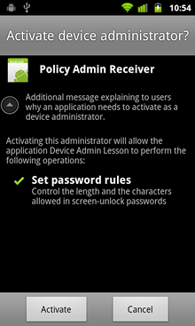 如果用户选择"Activate",程序就会获取设备管理员权限并可以开始配置和执行策略。 当然,程序也需要做好处理用户选择放弃激活的准备,比如用户点击了“取消”按钮,返回键或者HOME键的情况。因此,如果有必要的话,策略设置中的onResume())方法需要加入重新评估的逻辑判断代码,以便将设备管理激活选项展示给用户。