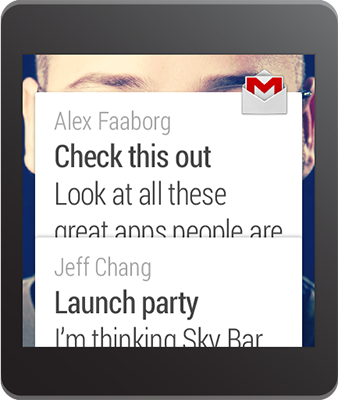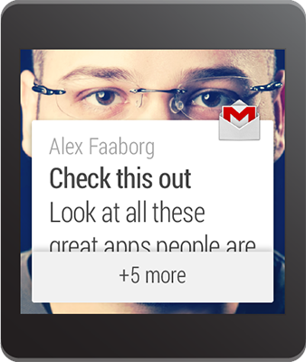 尽管如此,一个概括式的Notification在可穿戴设备上并不是很有用处,因为用户不能在可穿戴设备上阅读每条消息的详细内容(他们必须在手持式设备上打开相应的app才能看到更多信息)。所以对可穿戴设备而言,开发者应该将所有的Notification都集中起来,放成一叠。这叠Notification以一张卡片的形式显示出来,用户可以将它展开,分别看到每个Notification的详细内容。通过新方法setGroup())能够实现该功能,同时,也能保持手持式设备上显示为一条概括式的Notification。