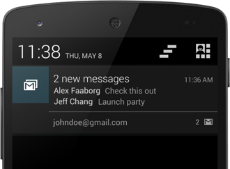 该Notification使用了NotificationCompat.InboxStyle,这个style能够让开发者很轻松地创建邮件或者短信app的Notifications。开发者可以对概括式Notification使用这个style,或者NotificationCompat中定义的其他style,或者不使用任何style也可以。