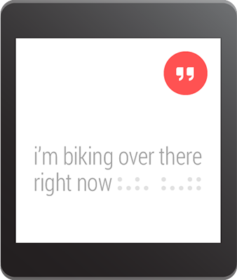 如果手持式设备上的Notification包含了一个输入文本的action,比如回复邮件,那么这个action正常情况下应该会调起一个activity让用户进行输入。但是,当这个action出现在可穿戴式设备上时,是没有键盘可以让用户进行输入的,所以开发者应该让用户指定一个反馈或者通过RemoteInput预先设定好文本信息。